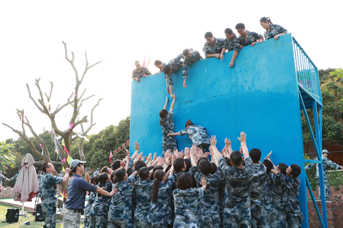 畢業(yè)墻訓(xùn)練項(xiàng)目中4.2米的高墻,沒有任何工具; 要求所有隊(duì)員全部通過,能夠依靠的只有雙手和雙肩; 一個(gè)人的力量是有限的,但團(tuán)隊(duì)的力量是無窮的!