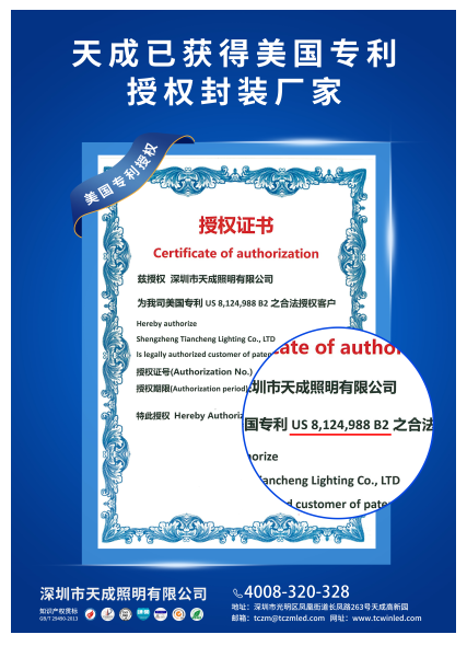 我司已與矽誠科技公司達成專利授權許可合約,深圳市天成照明有限公司為美國專利 US8124988B2 之合法授權封裝廠家。