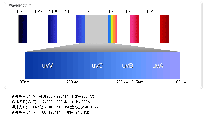 紫外光的波長比可見光短,但是比X射線長。紫外光在電磁波譜中,范圍波長為10—400 nm。這范圍內開始于可見光的短波極限,而與X 射線的長波波長相重疊。紫外光分為A 射線、B 射線和C 射線(分別簡稱UVA、UVB 和UVC)3種,波長范圍分別為400—315nm,315—280nm,280—190nm。
