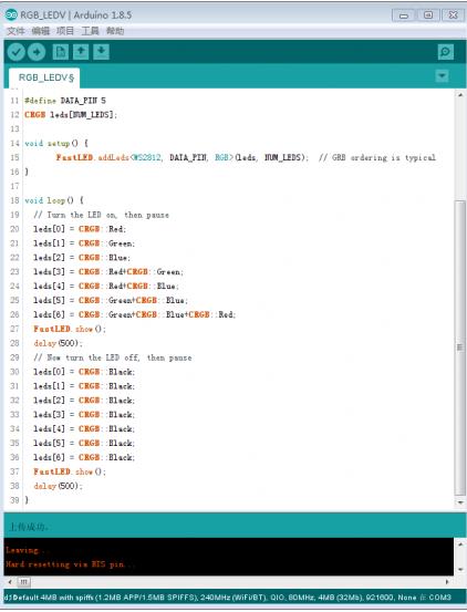 對于60點的彩色燈帶,其顯示程序如下: 要在ArduinoIDE中編寫程序,需添加第三方的FastLED庫,其添加與使用方法為: 1.選取“項目”菜單下“加載庫”的“管理庫”選項,在庫管理器的搜索欄,輸入“FastLED”; 2. 在出現搜索結果后,點擊“安裝”按鈕; 3. 在完成安裝后,即可見到“INSTALLED”的提示,然后點擊“關閉”以返回原界面;